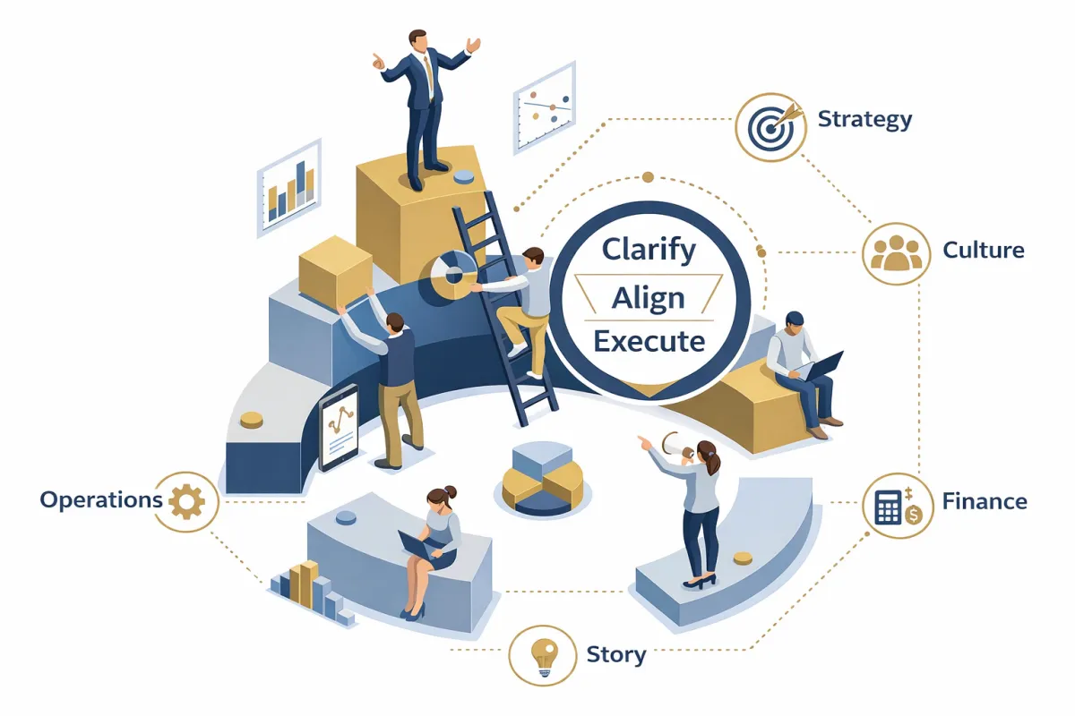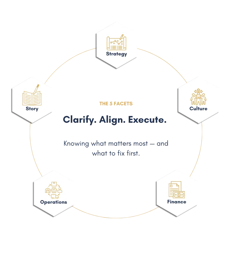 Most businesses don’t fail from lack of effort — they stall because Strategy, Operations, Finance, Story (Sales/Marketing), and Culture aren’t aligned.